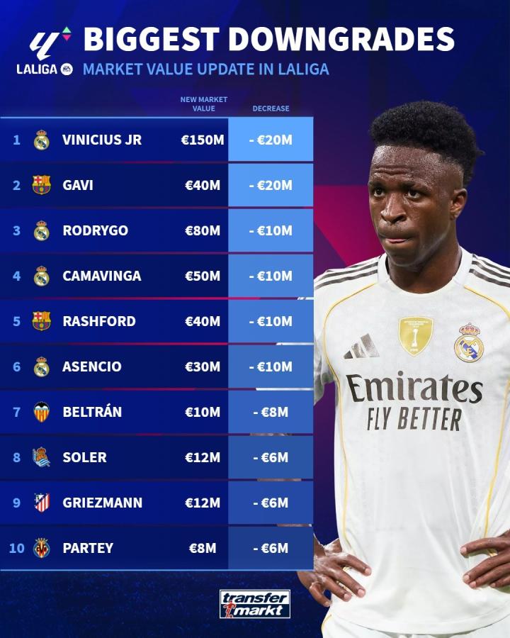 在完成西甲球员身价更新后,德国转会市场网站正式发布了西甲球员身价跌幅排行榜前十,其中维尼修斯与加维身价均大幅下滑2000万欧元,为跌幅最大者。